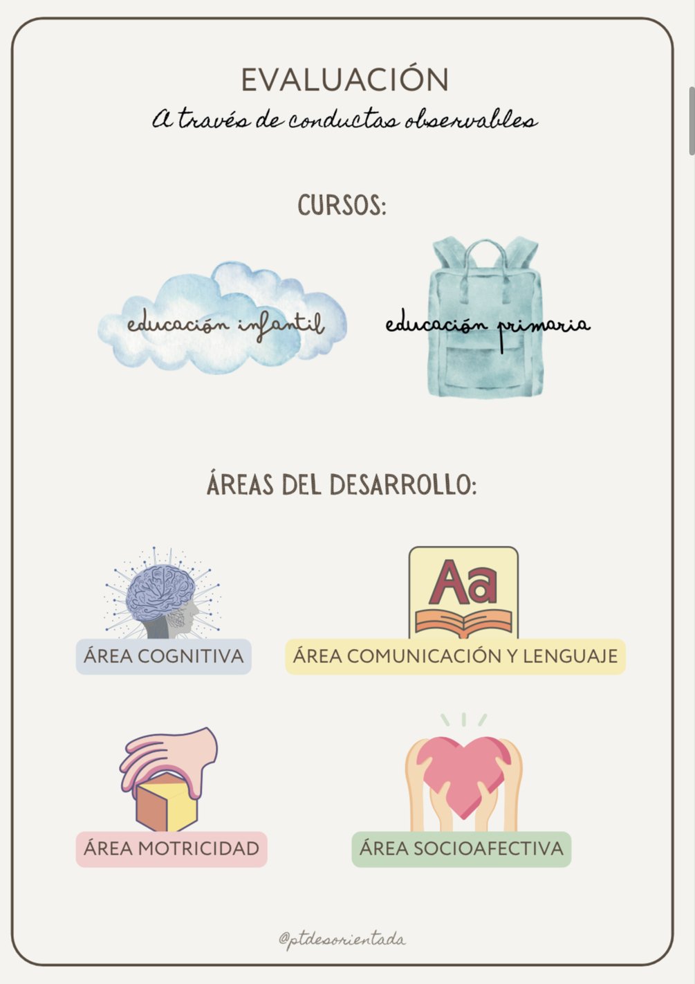 Material para evaluar hitos del desarrollo a través de conductas observables organizados por cursos y áreas del desarrollo. En total son 36 rúbricas; 4 por cada curso escolar.